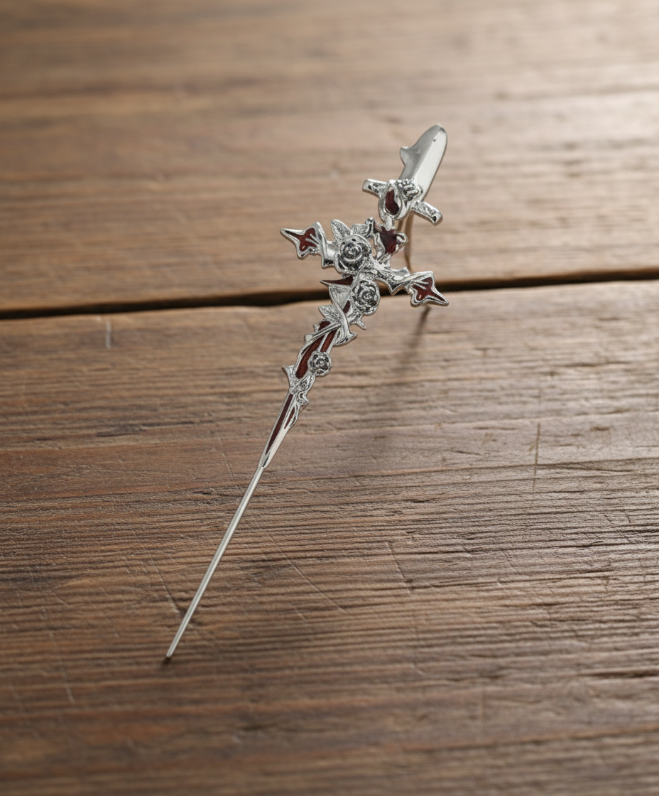 Une croix hérissée de lames, des éclats de rouge profond et une tige longue et fine qui prolonge la ligne de la mâchoire : c’est le bijou parfait pour donner une aura dark à n’importe quelle tenue.